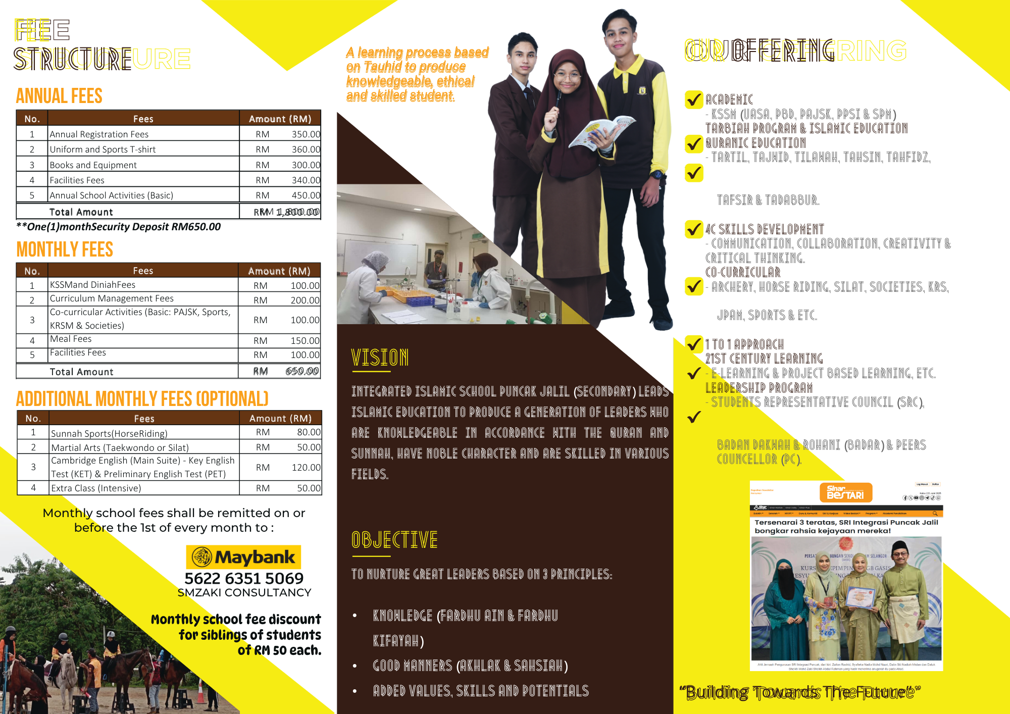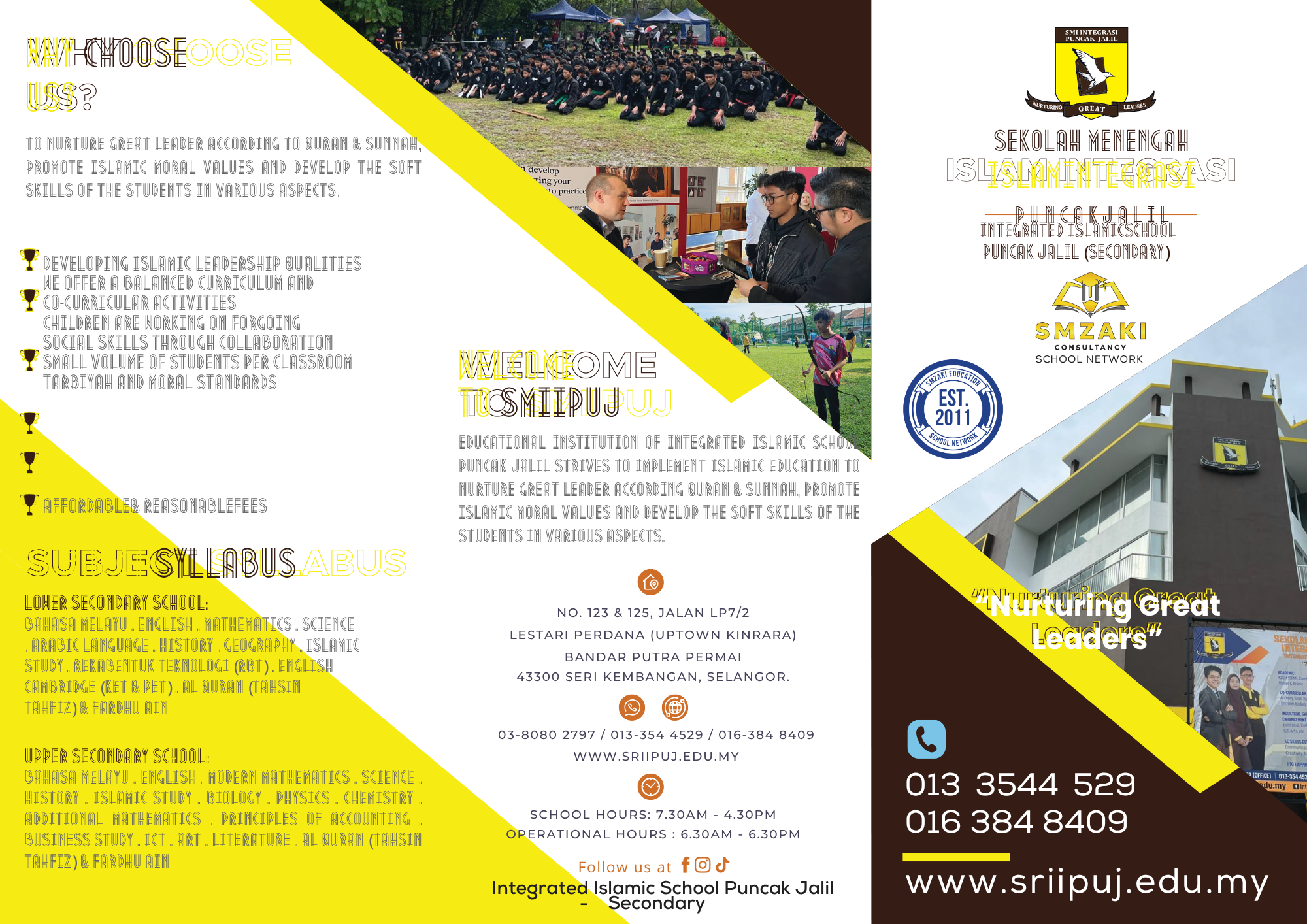 Educational Instruction of Integrated Islamic School Puncak Jalil strives to implement Islamic Education to nurture great leader according Quran & Sunnah, promote Islamic moral values and develop the soft skills of the students in various aspects.