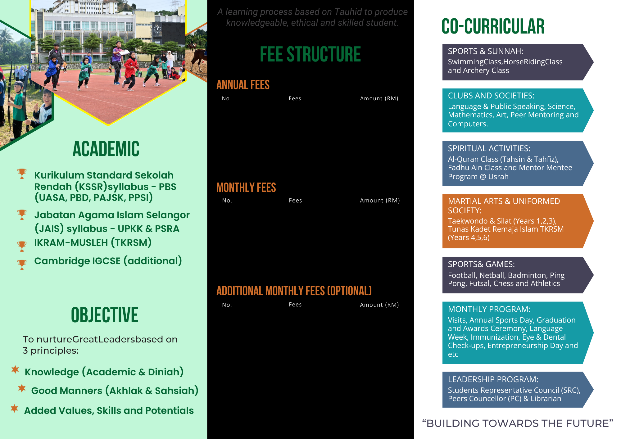 The school promotes Islamic moral values, strong character (akhlak), and life skills — preparing students to be leaders of tomorrow guided by faith and integrity.